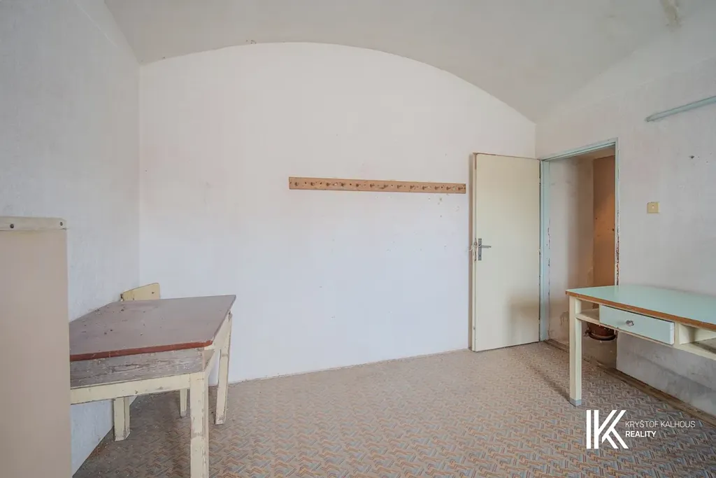 V chodbě se po pravé straně nachází samostatná toaleta a dále v čele chodby stojí koupelna, připravená na kompletní modernizaci. Na vstupní chodbu navazuje vstup do odkloněné části přízemí, začínající chodbou s technickým zázemím, schody do sklepa a schody na půdu. Tato část nabízí obrovský potenciál – z půdy lze vybudovat obytné podkroví s výhledem do krajiny, zatímco sklep může posloužit jako vinárna, sklad potravin či wellness zóna s kamennými klenbami a původními stěnami, které si zachovaly přirozený chlad. Na samotném konci domu pak naleznete poslední velký pokoj, odkloněný lehce stranou. Tento prostor, původně hospodářského charakteru, si přímo říká o přeměnu – může z něj vzniknout ateliér, dílna, nebo další obytná jednotka.