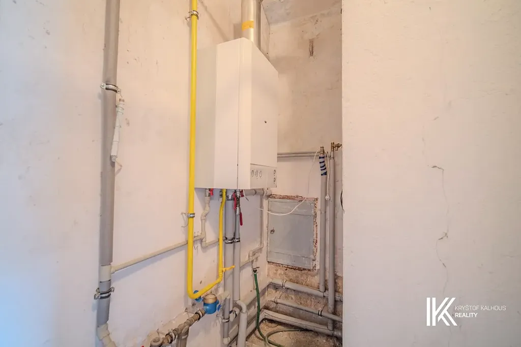 V chodbě se po pravé straně nachází samostatná toaleta a dále v čele chodby stojí koupelna, připravená na kompletní modernizaci. Na vstupní chodbu navazuje vstup do odkloněné části přízemí, začínající chodbou s technickým zázemím, schody do sklepa a schody na půdu. Tato část nabízí obrovský potenciál – z půdy lze vybudovat obytné podkroví s výhledem do krajiny, zatímco sklep může posloužit jako vinárna, sklad potravin či wellness zóna s kamennými klenbami a původními stěnami, které si zachovaly přirozený chlad. Na samotném konci domu pak naleznete poslední velký pokoj, odkloněný lehce stranou. Tento prostor, původně hospodářského charakteru, si přímo říká o přeměnu – může z něj vzniknout ateliér, dílna, nebo další obytná jednotka.