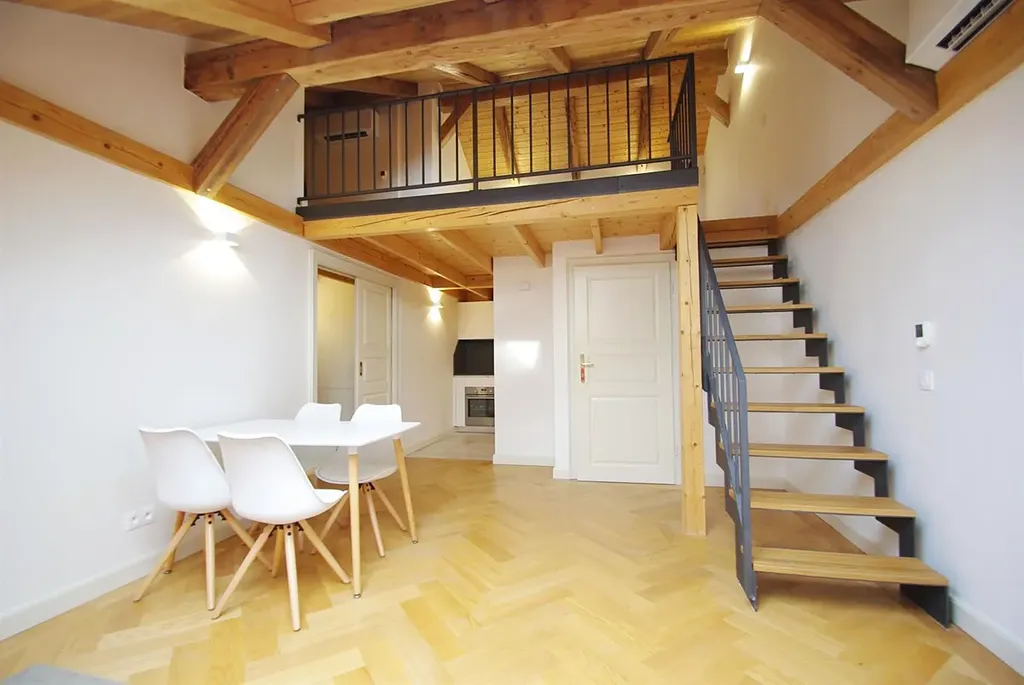 Moderní zařízený mezonetový byt 3+kk, s celkovou plochou 81,15m2, je situovaný v 5. patře (posledním patře) rezidenční historické budovy, která prošla kompletní rekonstrukcí. Zachovaly se štukové stropy, dřevěné obložení a další specifické prvky. Byt se nachází v Bolzanově ulici na Novém Městě přímo v centru Prahy 1.