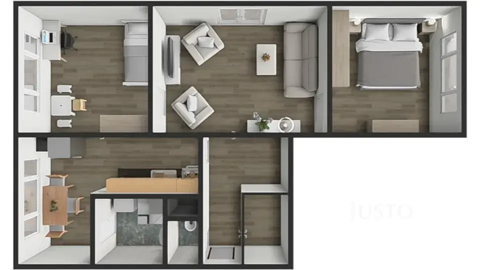 Dispozice bytu nabízí prostorný obývací pokoj (16,2 m²), dva samostatné pokoje (ložnice a dětský pokoj, každý 12,3 m²), kuchyň s jídelní částí (11,1 m²) a předsíň (5,6 m²) s praktickým úložným prostorem/komorou (2,1 m²). Byt je částečně vybaven a připraven k nastěhování či případné modernizaci dle vlastních představ. K bytu náleží sklep, což oceníte pro další možnosti uskladnění.