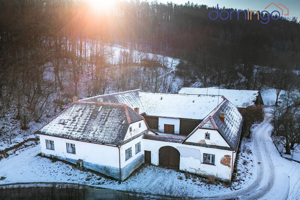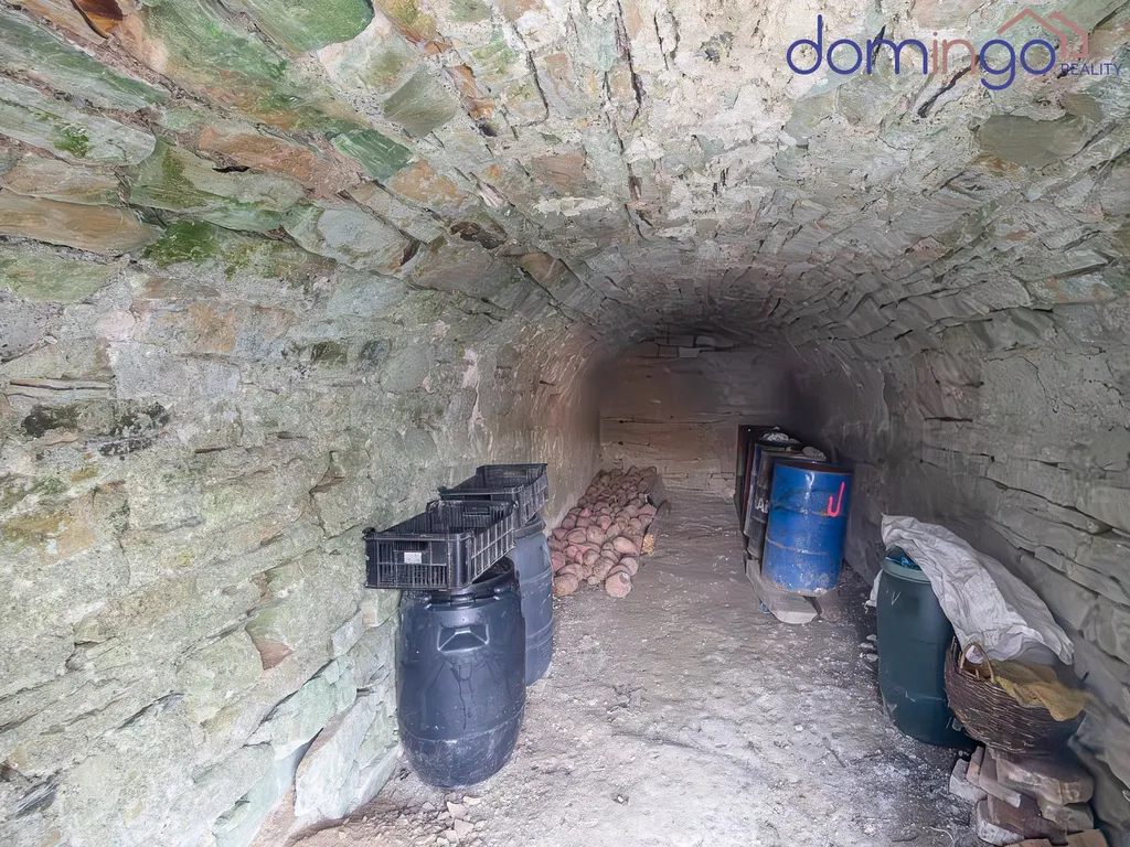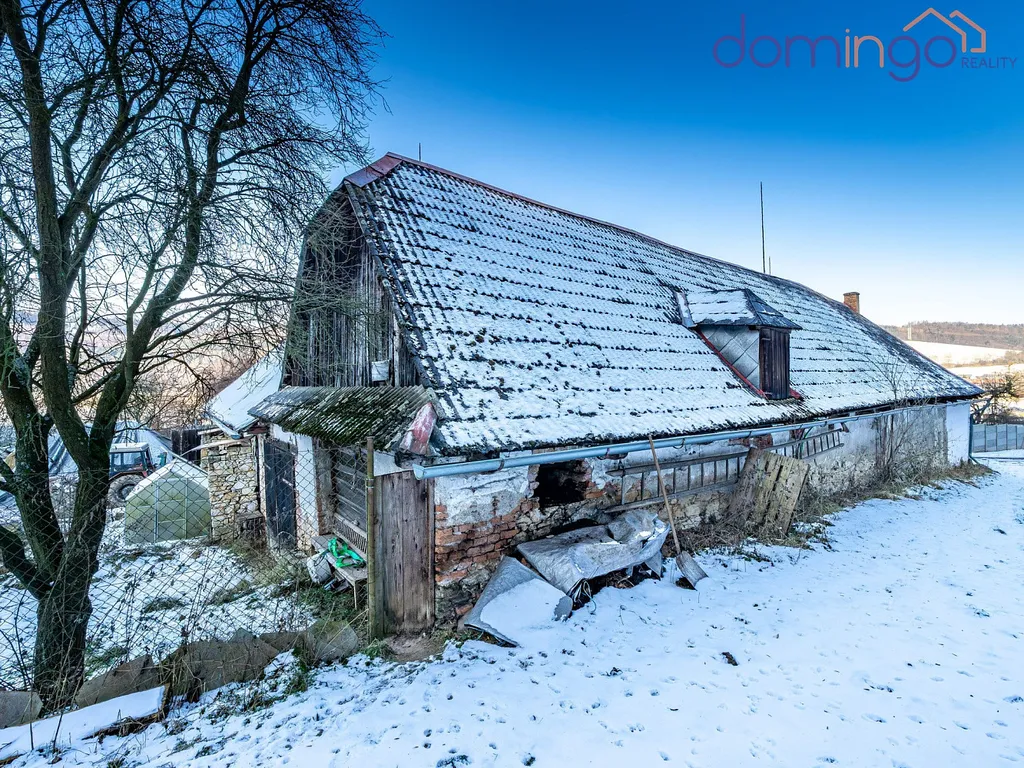 Za hlavním stavením se nachází bývalé stáje a sklep vyzděný do terénu určený ke skladování úrody – chladný, funkční a stále plně využitelný. Celým pozemkem vede soukromá cesta, která umožní dostat se autem až nahoru na kopec.
