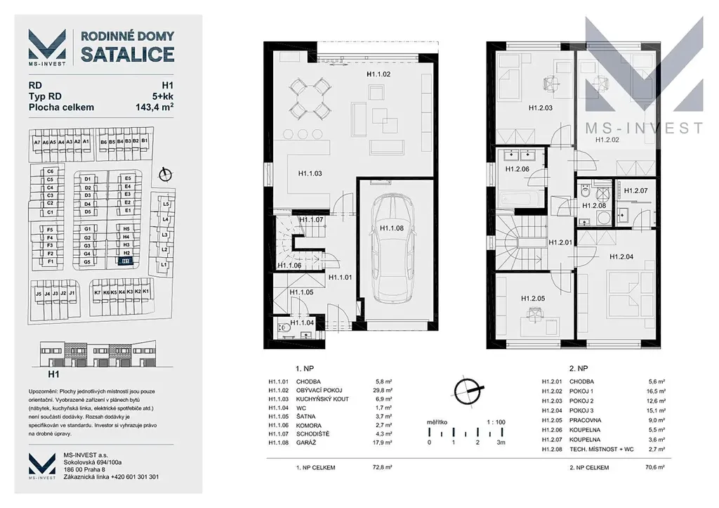 V rámci developerského projektu Rodinné domy Satalice se v nově vzniklé ulici Hubačova nachází nabízený krajní dům H-1 velikosti 5+kk a celkové ploše 144 m2 s větším pozemkem o ploše 271 m2. Tento dům disponuje v 1. NP vlastní garáží, šatnou, komorou, toaletou, prostorným obývací pokojem s kuchyňským koutem o ploše 37 m2 a navazující terasou propojující dům se zahradou. Ve 2. NP se nachází hlavní ložnice o ploše 17 m2, včetně samostatné koupelny se sprchovým koutem a vstupem přímo z ložnice, dále další dvě ložnice, pracovna, další koupelna s vanou a dvěma umyvadly a samostatné WC spojené s technickou místností. Zahrada je orientována na západ. Kromě vlastní garáže je možné parkovat další auto na vlastním pozemku před domem. V ceně domu je mimo jiné fotovoltaika s bateriovým úložištěm a napojením do distribuční soustavy a dálkově ovládané hliníkové předokenní žaluzie na všech oknech. V rámci developerského projektu Rodinné domy Satalice vznikne celkem 48 řadových rodinných domů provedených ve třech variantách s dispozicemi 4+kk až 5+kk, užitnou plochou od 127 m2 až 160 m2. Pozemky s výměrou až 363 m2 nabídnou dostatek prostoru pro celou rodinu.
