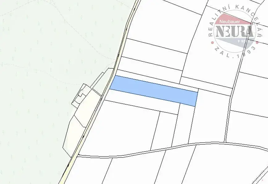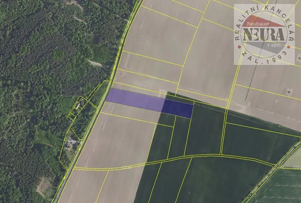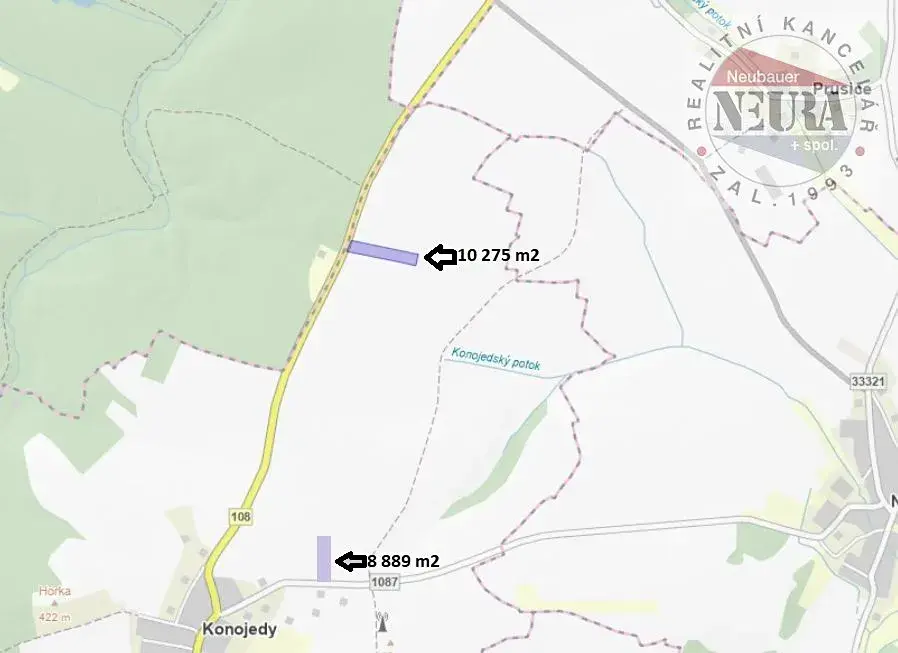 pozemek o celkové výměře 10 275 m2 vedený v katastru nemovitostí jako orná půda, umístěný mezi obcemi u silnice č. 108