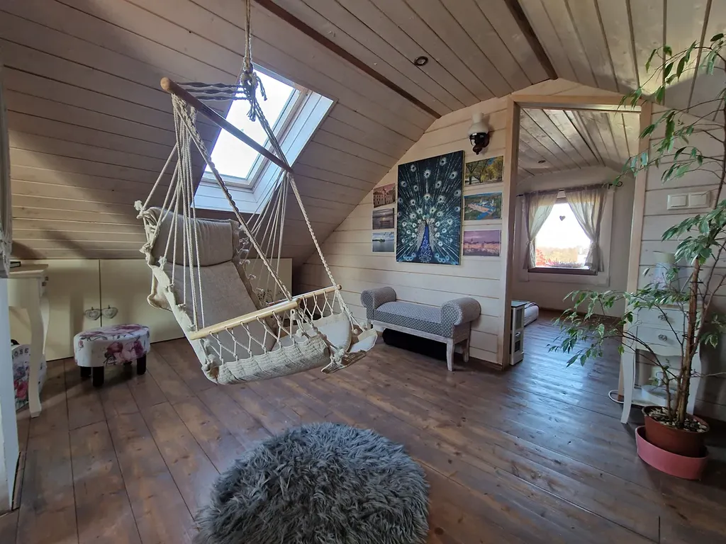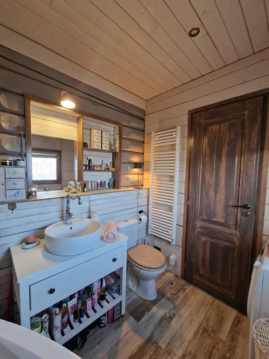 Stylová novostavba finského srubového domu se nachází na klidném místě obce. Nabízí útulné a promyšlené zázemí, kdy v přízemí najdete vstupní chodbu, šatnu, koupelnu s vanou a WC, kuchyňský kout zařízený kuchyňskou linkou v provensálském stylu, jídelní prostor, pracovnu a obytný prostor kde jeho dominantou jsou krásná kachlová kamna. Z obytného pokoje je vstup na zahradu. Dřevěným schodištěm se dostaneme do podkroví, kde je ložnice a relaxační místnost.