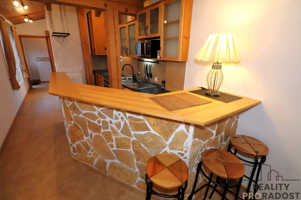- Dispozice: Vstupní předsíň s úložným prostorem, prostorný obytný pokoj s kuchyňským koutem a barem, koupelna s vanou, WC a topným žebříkem.