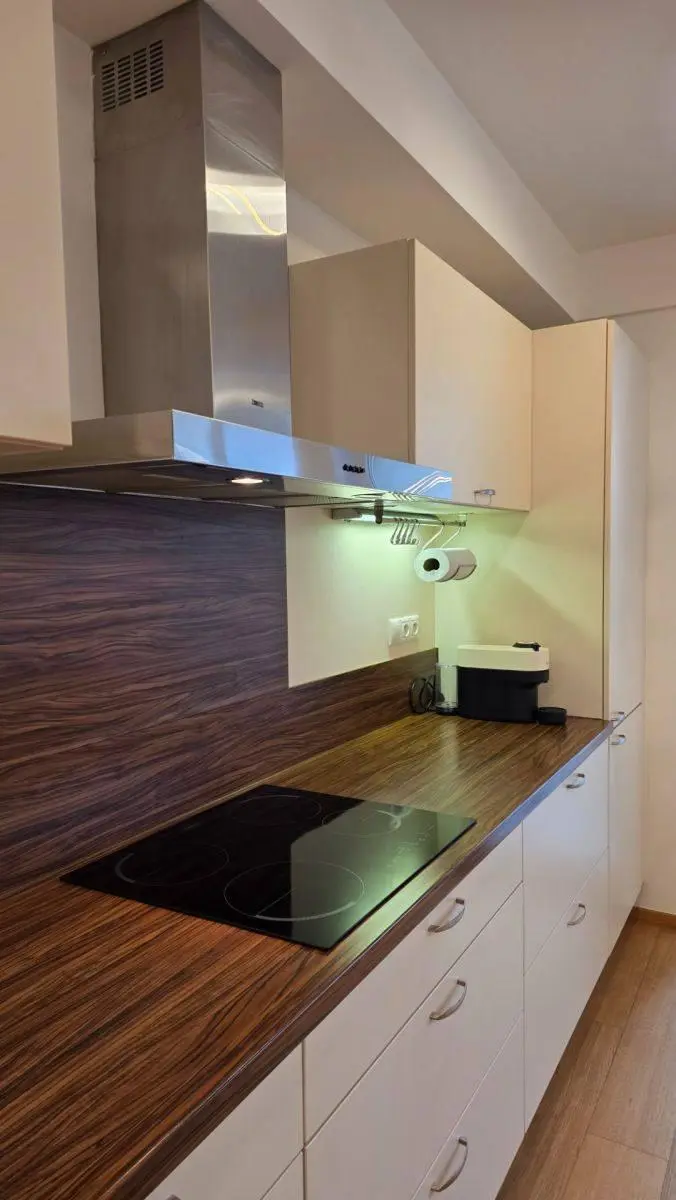 Byt je vybaven kvalitní kuchyňskou linkou se spotřebiči, dřevěnými podlahami, velkou vestavěnou šatní skříní, samostatnou skříní na boty a dostatkem úložných prostor. Po dohodě je možné doplnění dětské postýlky nebo dalších úložných skříní.