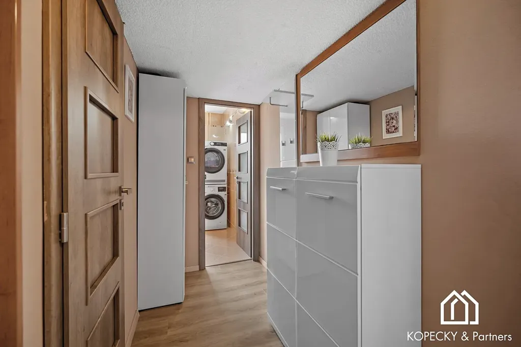 Velkým benefitem je lodžie, která přidává další využitelný prostor – ať už na ranní kávu, bylinky nebo večerní klid. Další praktickou výhodou je komora na patře, kterou v městských bytech oceníte každý den. Bez problému sem uložíte sezónní věci, sportovní vybavení, vysavač, kufry nebo kočárek a byt tak zůstane vzdušný a uklizený.