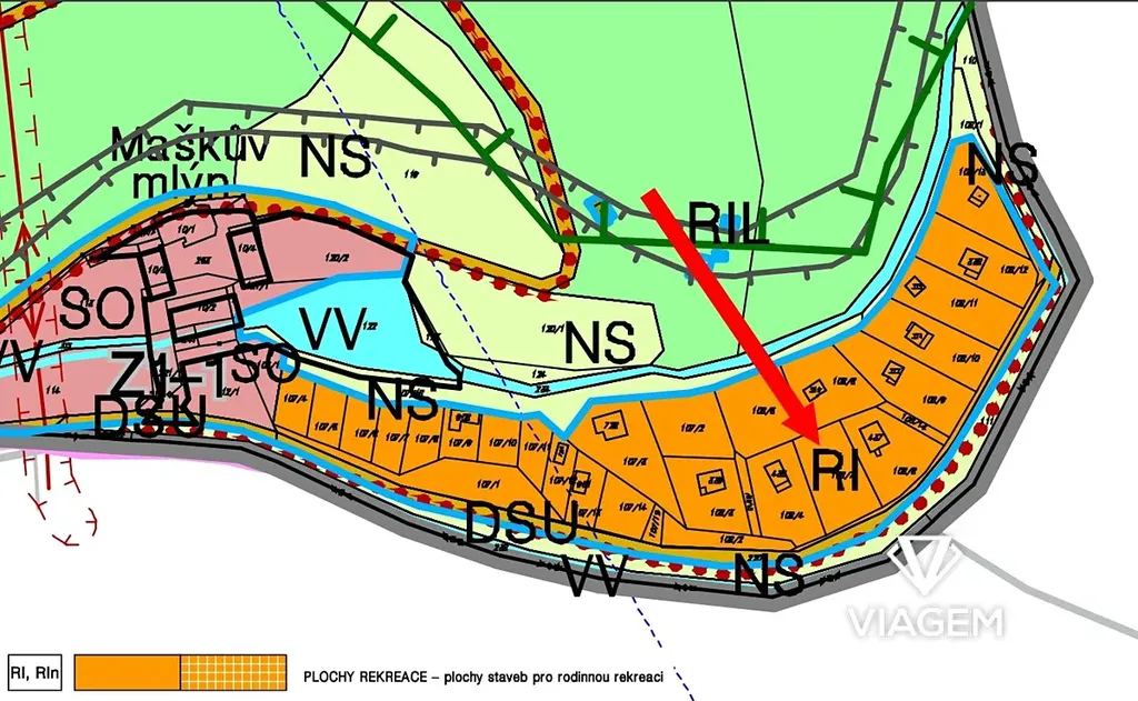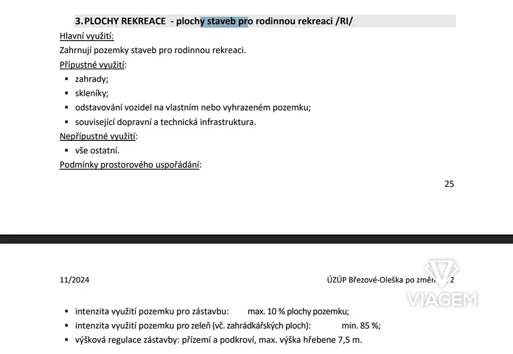 Územní plán dovoluje výstavbu objektu (RI - PLOCHY REKREACE - plochy staveb pro rodinnou rekreaci)