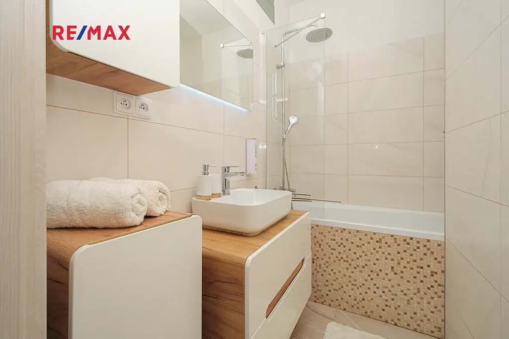 Interiér bytu je světlý, moderní, plně vybavený a připravený k nastěhování od 1.3. 2026. Výhodou je klidný vnitroblok s malým hřištěm a pískovištěm pro děti.