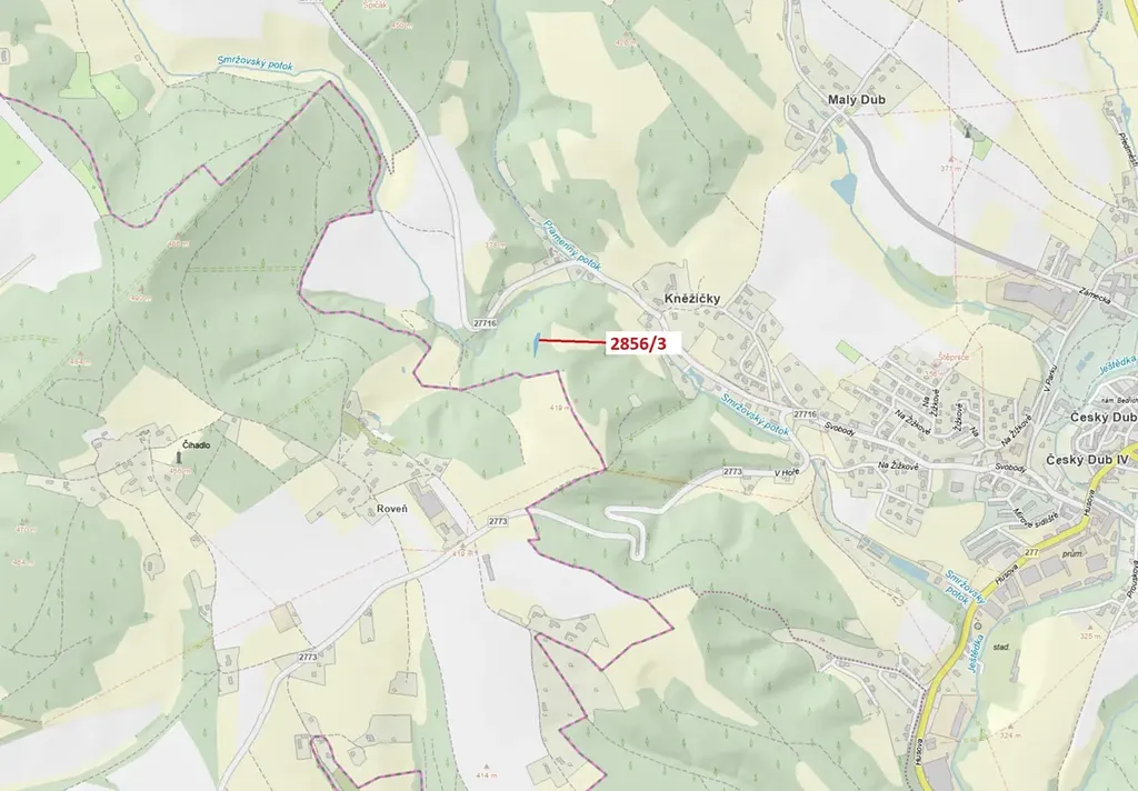 Lesní pozemek o výměře 448 m2, parcelní číslo 2856/3, podíl 1/1, katastrální území Český Dub, obec Český Dub, obec s rozšířenou působností Liberec, okres Liberec, Liberecký kraj. Po těžbě.