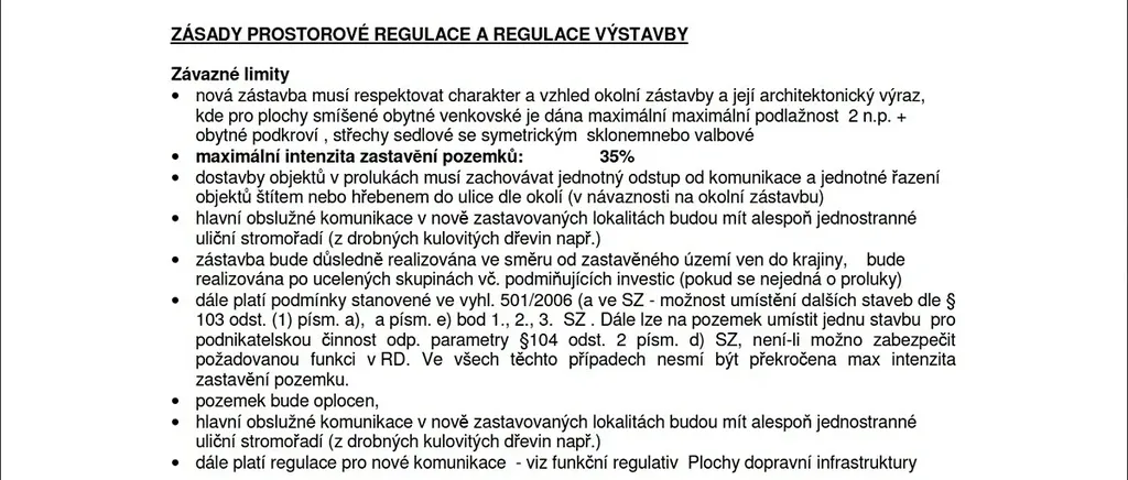 Dle územního plánu je celková plocha pozemku pro výstavbu (včetně stávajících budov) 5 300 m², vedená jako plochy smíšené obytné venkovské (SV). Tyto pozemky umožňují: