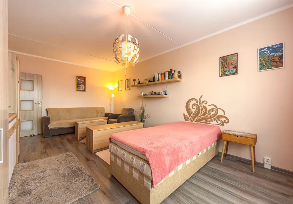 Nabízím k pronájmu byt v družstevním vlastnictví o dispozici 1+1 a celkové výměře 39 m². Byt se nachází v 6. patře kompletně revitalizovaného panelového domu s novým výtahem v klidné lokalitě Jirkova, ulice SNP.