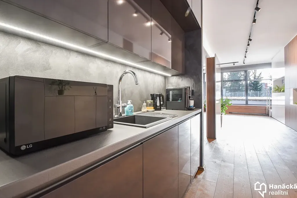 Prostory jsou kompletně vybavené a připravené k okamžitému užívání bez nutnosti dalších investic. Součástí kanceláře je kvalitní kancelářský nábytek včetně pracovních stolů, dvě klimatizační jednotky Samsung, videotelefon, chytré zámky ovládané pomocí mobilní aplikace a elektricky ovládané rolety Somfy. Vysoký standard doplňuje plně vybavená kuchyň a moderní sociální zázemí s WC a sprchovým koutem.
