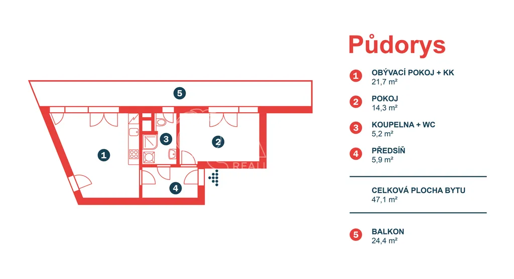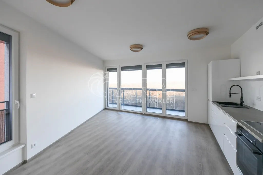 Byt o celkové výměře 78 m² (vnitřní plocha bytu 47,1 m², balkon 24,4 m², sklep 6,5 m²) je umístěn v 5. NP novostavby bytového domu z roku 2025. Byt sestává z obývacího pokoje s kuchyňským koutem, ložnice, koupelny se sprchovým koutem a WC a předsíně. V bytě je položena vinylová podlaha a dlažba. Orientace bytu je na sever. Z obývacího pokoje a ložnice je možný vstup na velkorysý balkon s výhledem do rozlehlé zeleně hostivařské přehrady. Byt je vybaven kuchyňskou linkou s vestavěnými spotřebiči, prostornými vestavěnými skříněmi v předsíni, pračkou kombinovanou se sušičkou, rekuperací vzduchu a venkovními žaluziemi na dálkové ovládání ve všech oknech (vč. koupelny). K bytu dále náleží nadstandardně velký sklep, který je umístěn v suterénu domu hned za garážovým stáním o velikosti stání pro invalidy, které je dále možné si pronajmout za 3.000 Kč/měsíc. Sklep se pronajímá spolu s bytem.