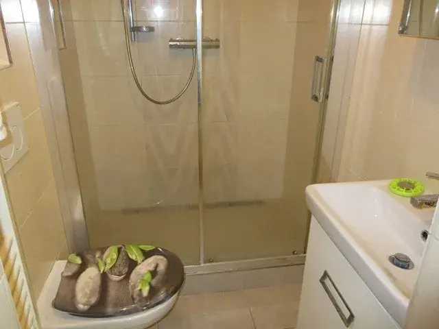 Koupelna má prostorný sprchový kout a WC.