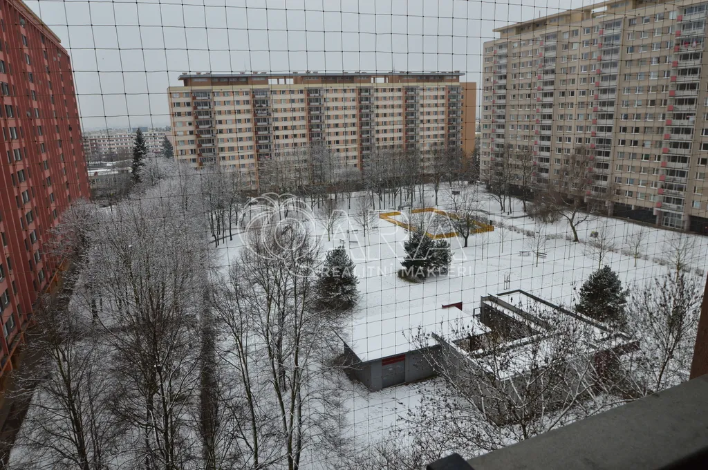 Z balkónu, opatřeného sítí proti holubům je výhled do klidného vnitrobloku, kde je komunitní centrum.