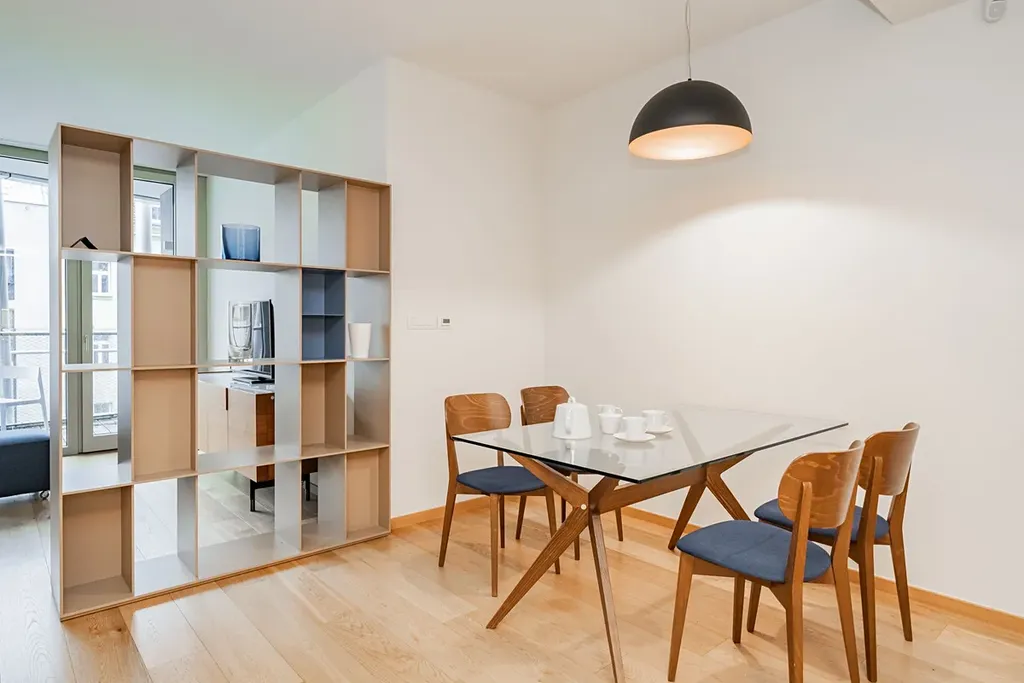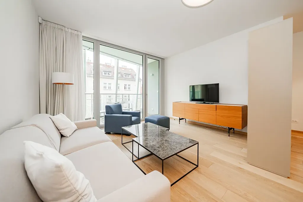 Stylový zařízený byt 2+kk (1 ložnice, 1 koupelna), s terasou (14,28m2) a celkovou plochou 87,92m2, je situován ve 3. patře luxusního rezidenčního komplexu s výtahem, recepcí, bazénem, saunou, prostornou zahradou ve dvoře, sklepem a možností parkování v podzemním parkovišti.