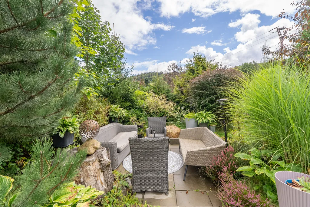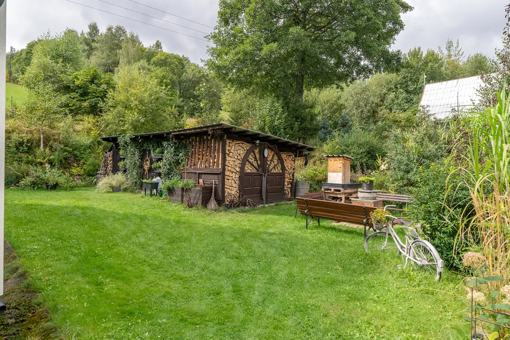 Celková plocha pozemku je cca 1050 m2 a k tomu podíl na soukromém parkovišti. Samotná chalupa stojí v mírném kopci, ale za ní již nejsou žádní sousedé, takže úžasné místo, co myslíte? Kolem chalupy na Vás čeká několik zákoutí s posezením a okrasnou udržovanou zahradou. Potřebné věci a dřevo na zimu můžete skladovat v zahradním domku vedle domu.