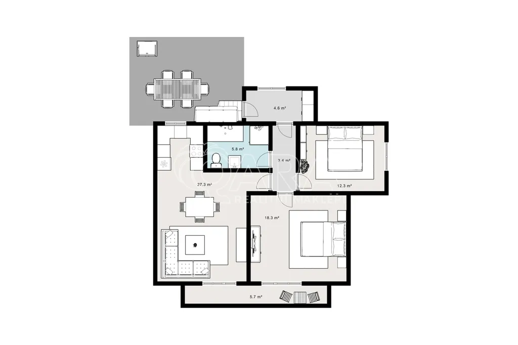 Dispozice: zádveří, chodba, prostorný obývací pokoj s vybaveným kuchyňským koutem (27,3 m2; spotřebiče: myčka, el. sklokeramická varná deska, el. trouba), dvě ložnice (12,3 m2, 18,3 m2), koupelna s vanou, sprchovým koutem a WC, balkon přístupný z obývacího pokoje a z větší ložnice, a dále prostorná terasa.