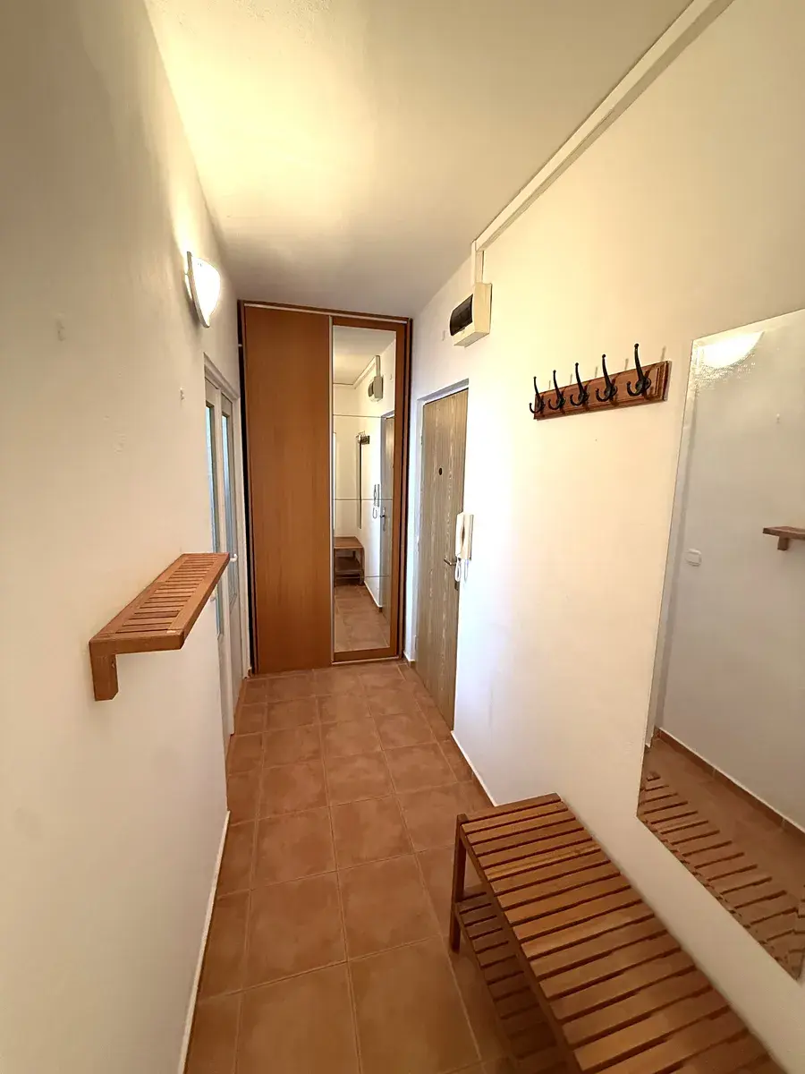 Po vstupu do bytu je zde velmi prostorná chodba (8 m²) s vestavnými skříněmi, která zpřístupňuje jednotlivé místnosti v bytě. Dále se zde nachází hlavní obytný prostor (17 m²), ložnice s dvojlůžkem a velkou skříní (15 m²) a třetí pokoj (15 m²) vybavený postelí, gaučem, stolem a dalšími skříněmi. Součástí bytu je také jídelna s jídelním stolem a židlemi (8 m²) a kuchyně (5 m²) s velmi pěknou kuchyňskou linkou (lednice s mrazákem, trouba, plynový vařič, myčka, dřez, digestoř). Dále je k dispozici koupelna (3 m²) s vanou, umyvadlem, zrcadlem a pračkou a samostatná toaleta (1,5 m²). Praktickým benefitem v bytě je komora s vestavěným regálovým systémem (3 m²). Byt disponuje také balkonem o výměře 4 m². Bytový dům je zateplený a je v něm výtah. Vytápění je zajištěno ústředním dálkovým vytápěním s otopnými tělesy (radiátory) v jednotlivých místnostech.
