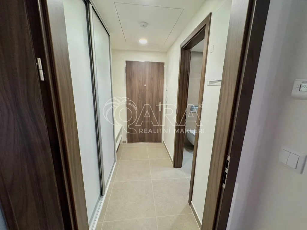 Dispozici bytu tvoří vstupní chodba s vestavěnou skříní, hlavní obytná místnost s kuchyňským koutem a rekuperační jednotkou a dále koupelna se sprchovým koutem a toaletou. Kuchyňská linka je plně vybavena spotřebiči – k dispozici je myčka, mikrovlnná trouba, trouba, elektrická varná deska a digestoř. Lednice s mrazákem bude dodána. V koupelně je k dispozici pračka.