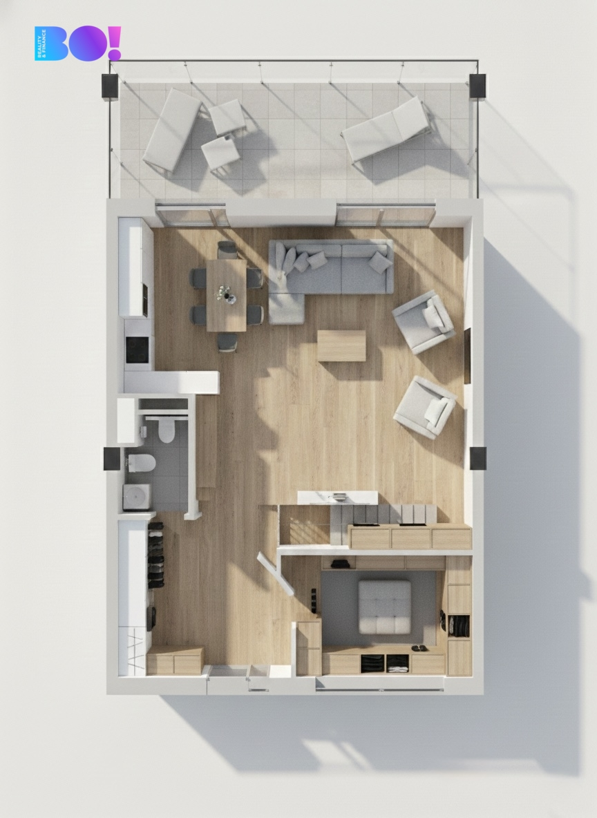 Byt nabízí praktické a promyšlené dispoziční řešení s maximálním využitím každého metru, dostatek úložného prostoru, terasu orientovanou na severozápad, prostorný obývací pokoj, dostatek sociálních zařízení a garážové stání přímo v domě.