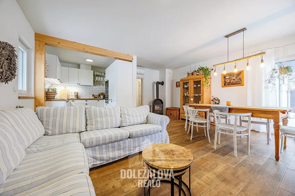 Dominantou domu je světlý obývací pokoj s kuchyní a přímým vstupem na terasu.