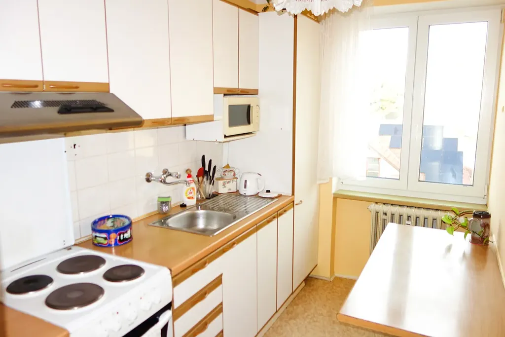Okna kuchyně, pokoje a koupelny jsou orientována na severovýchod, okna obývacího pokoje, ložnice s balkonem jsou orientována na jihozápad s výhledem do okolí na Poříčí nad Sázavou. K příslušenství bytu náleží suterénní zděná sklepní koje s oknem.Byt je umístěn v klidné lokalitě na malém sídlišti obklopeným rodinnými domy, s blízkostí řeky Sázavy a okolní přírody.