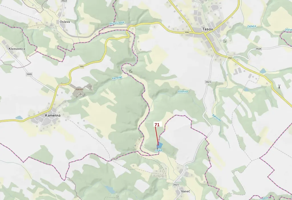 Lesní pozemek o výměře 6602 m2, parcelní číslo 71, podíl 1/1, katastrální území Vaneč, obec Pyšel, obec s rozšířenou působností Třebíč, okres Třebíč, Kraj Vysočina. Částečně po těžbě.