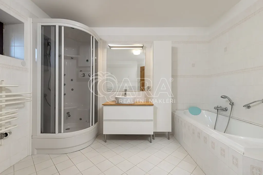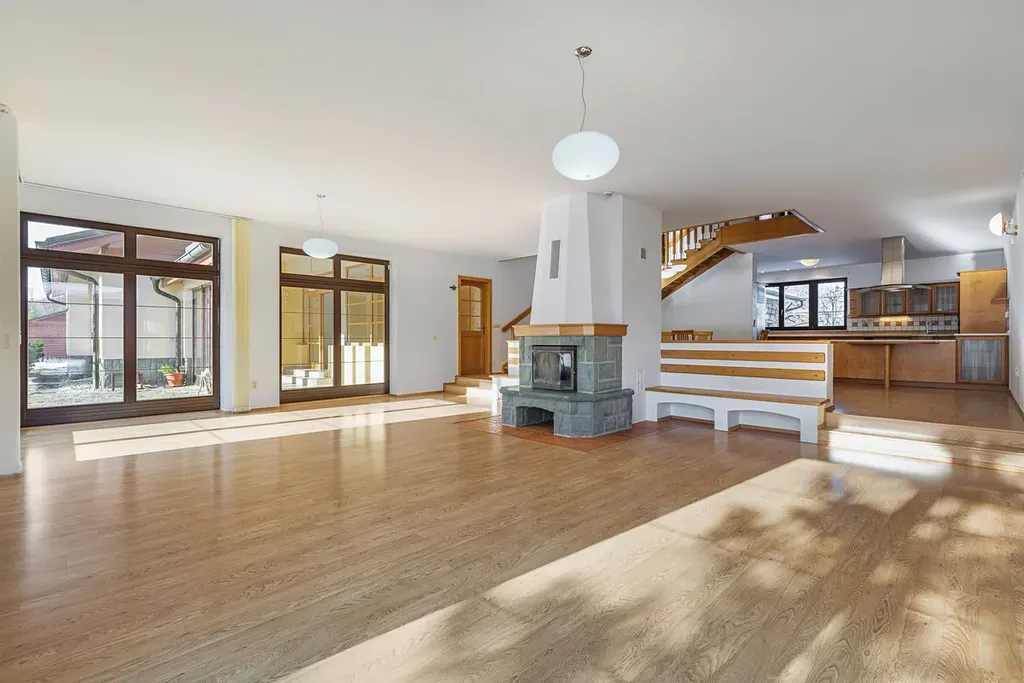 Dominantou domu je reprezentativně řešený obývací pokoj s krbem, propojený se zimní zahradou, jídelnou a kuchyní, doplněný galerií se schodištěm. Obytná část navazuje na terasu orientovanou do krajiny. Dispozice zahrnuje 7 samostatných ložnic, což umožňuje pohodlné rodinné i vícegenerační bydlení nebo kombinaci bydlení a práce z domova. Součástí domu je dále velkorysá knihovna s pracovnou, tělocvična, šatny, koupelny, rozsáhlé technické zázemí, dvojgaráž s přímým vstupem do domu, dílna, další samostatná garáž a domek pro zahradní techniku.