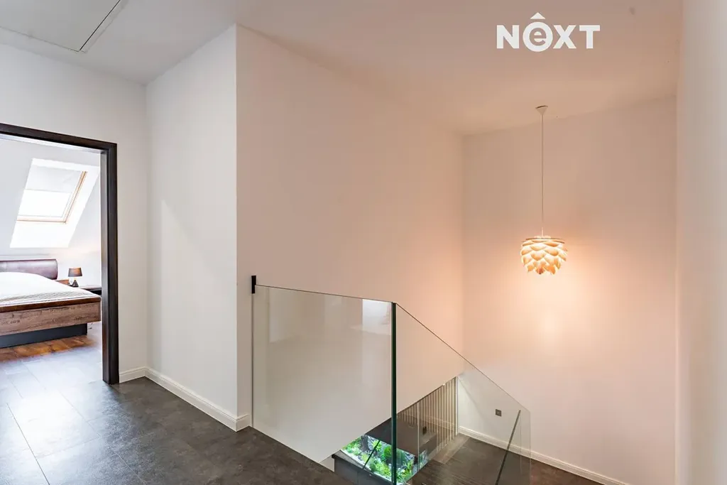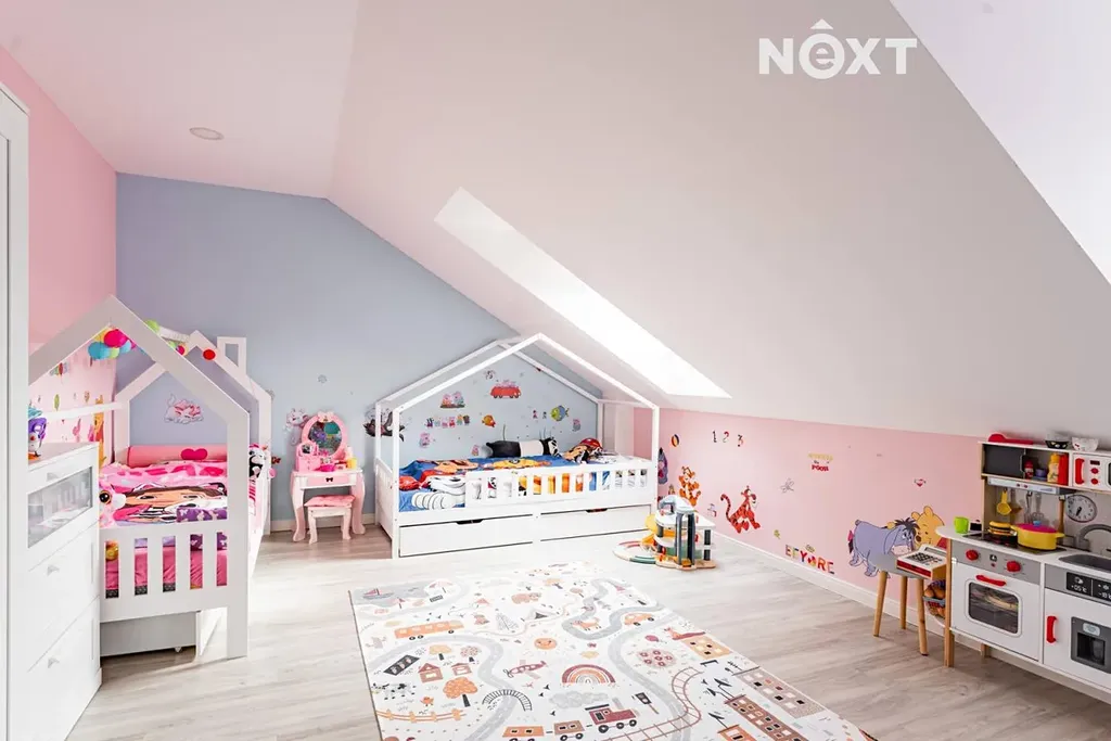Ve druhém podlaží najdete klidovou zónu, a to tři neprůchozí pokoje, přičemž hlavní ložnice má vlastní šatnu. Dále koupelnu s vířivou vanou, toaletou a skříňkou se dvěma umyvadly - vše navrženo pro maximální komfort rodiny.