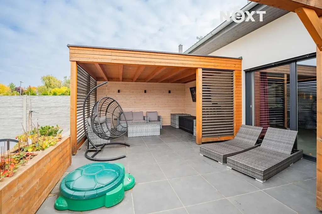 Terasa navazuje na menší, ale útulnou zahradu o výměře 223 m², kde si užijete naprostý klid, soukromí a hlavně dominantu zahrady, kterou je vyhřívaný bazén 5 × 3 m s přístřeškem.