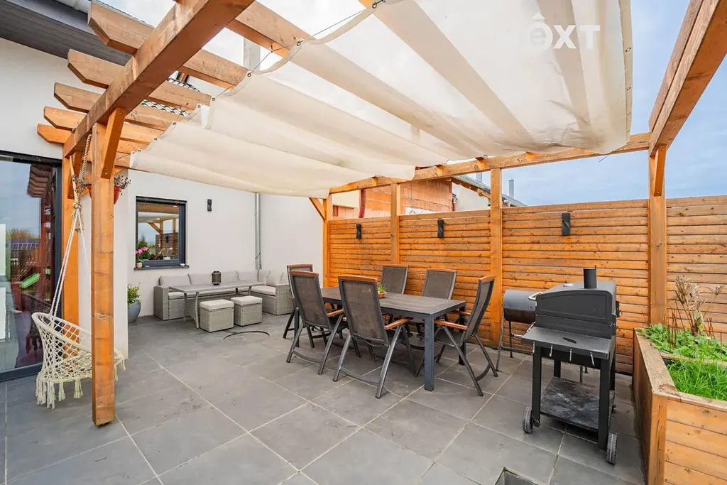 Dispozice je řešena prakticky – po vstupu vás přivítá prostorné zádveří, odkud vedou dveře do garáže, koupelny se sprchovým koutem a toaletou, také do technické místnosti se šatnou. Následně vstupujete do srdce domu – velký a světlý obývací prostor s propojený s kuchyňským koutem, odkud je přímý vstup na prostornou terasu o velikosti 63 m² se dvěma pergolami - skvělé místo pro grilování a pohodové letní večery s rodinou a přáteli.