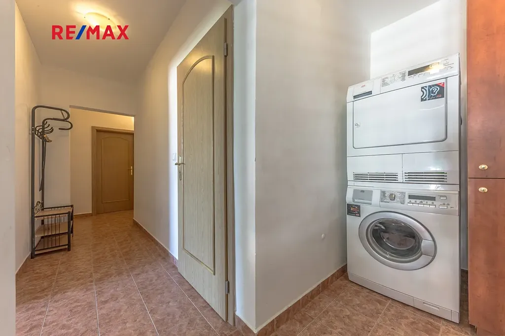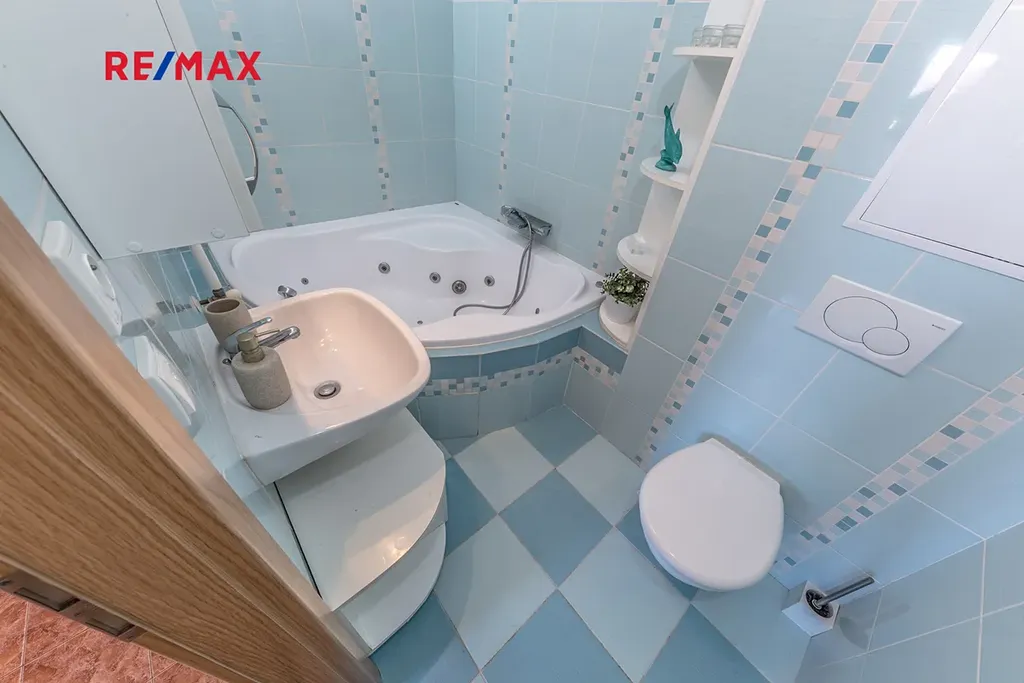 Koupelna s masážní vanou působí svěže a moderně a nabízí ideální prostor pro relax po náročném dni. Samozřejmostí je sklepní kóje pro praktické uskladnění věcí a k dispozici je také společná kočárkárna. V domě je zavedené rychlé optické připojení k internetu.