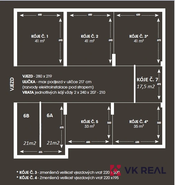 Příjezd ke skladu je jištěný elektrickou závorou a vjezd do objektu je vybavený elektrickými posuvnými vraty. Vjezdová vrata zaujímají rozměr o šířce 280 cm a výšce 219 cm.