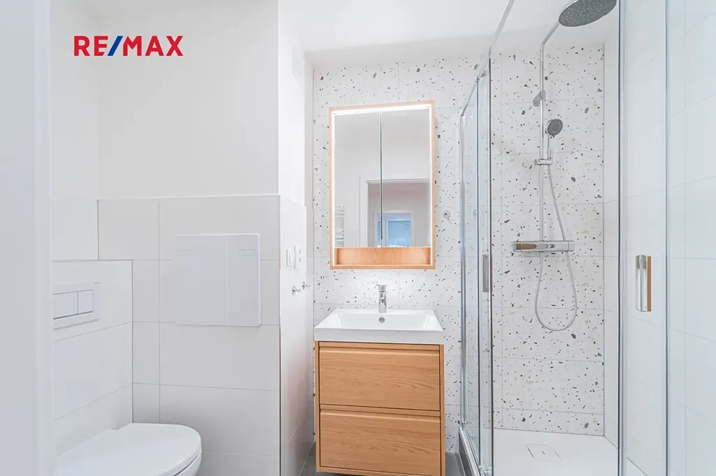 Byt má nové sádrokartonové stěny s akustickou izolací a stropní podhledy s úsporným LED osvětlením. Koupelna je vybavena koupelnovým nábytkem a moderním sprchovým koutem.