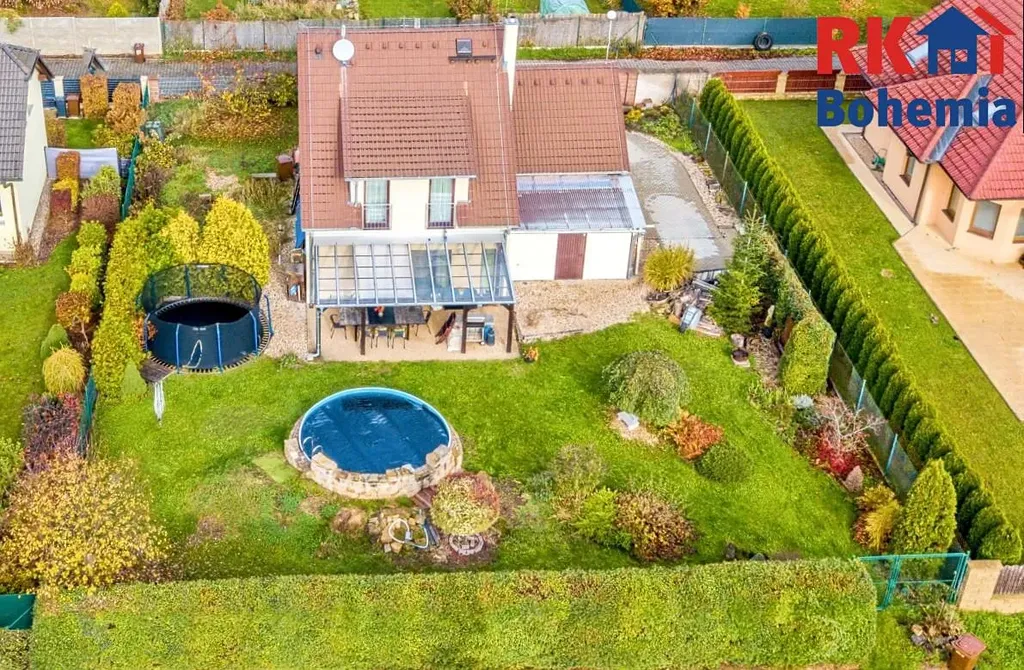 Zahrada je koncipována jako soukromá oáza pro celou rodinu a nabízí bazén i zapuštěnou trampolínu, které jsou citlivě včleněny do okolní zeleně s ovocnými stromy. Klidné bydlení je umocněno umístěním domu v bezpečné obytné zóně a slepé ulici, což minimalizuje okolní provoz.