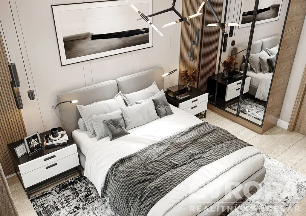 Velkorysá ložnice, vestavěné skříně pro maximální využití úložného prostoru.