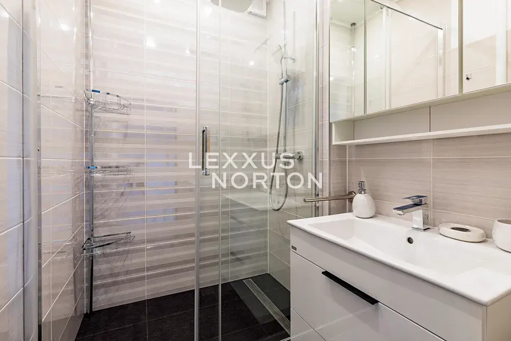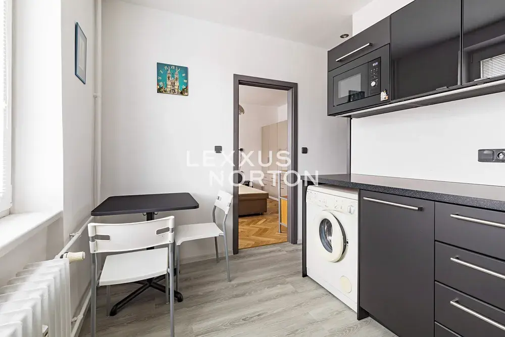 Moderně vybavená kuchyně nabízí veškeré potřebné spotřebiče, včetně sporáku, trouby, lednice, mrazáku, myčky nádobí, mikrovlnné trouby i pračky. Koupelna je vybavena sprchovým koutem a toaletou. V ložnici i chodbě jsou umístěny praktické vestavěné skříně. Podlaha je řešena kombinací parket, dlažby a plovoucí podlahy.