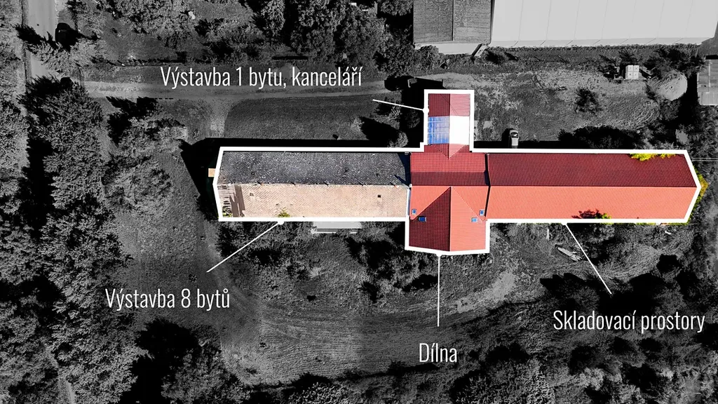 Na pozemku se dnes nachází částečně zrekonstruovaný objekt, který lze ihned využít nebo dále přestavět. V přízemí hlavní budovy se nachází byt o velikosti přibližně 60 m², v prvním patře další byt a téměř dokončený prostor o ploše 240 m². Součástí areálu je rovněž vybavená dílna s dvousloupovým zvedákem o nosnosti 3,2 tuny. Tyto prostory nabízejí okamžité možnosti využití pro firemní zázemí, sklady či dílnu, zatímco zbytek pozemku lze postupně zastavět podle již schváleného projektu.