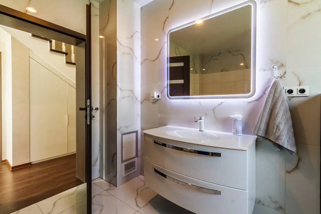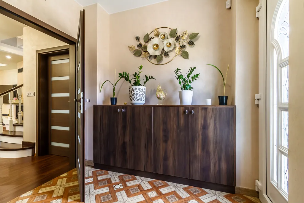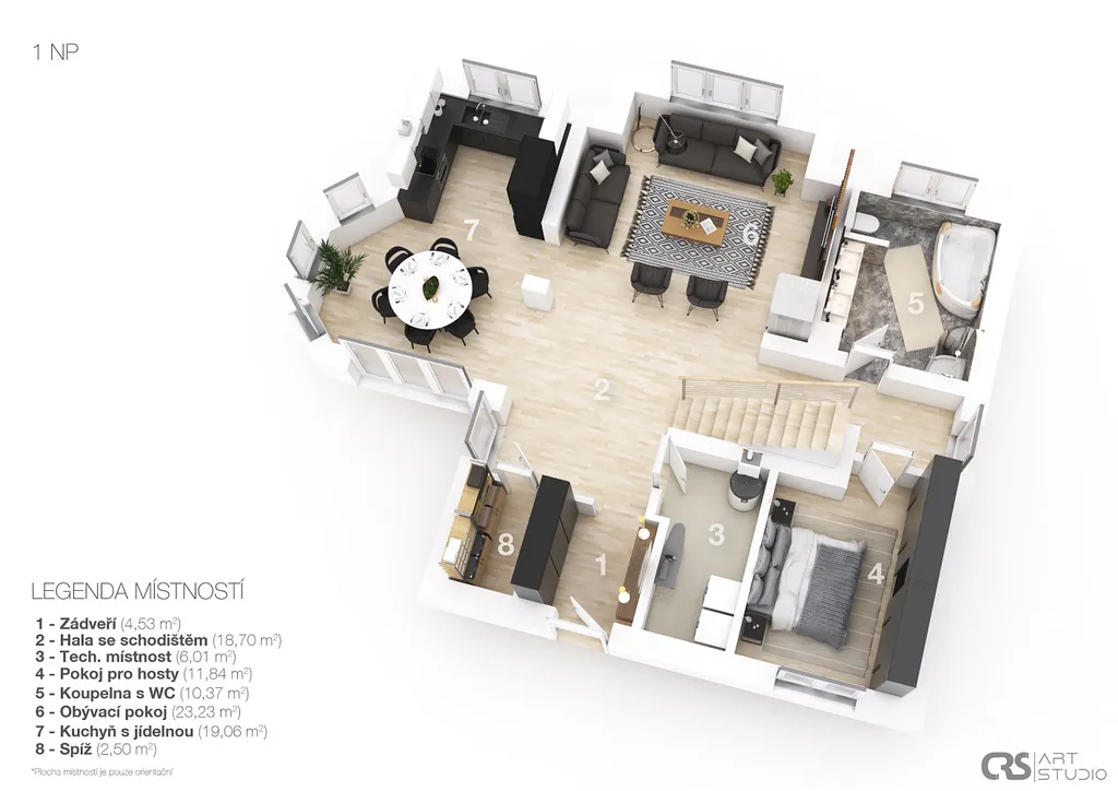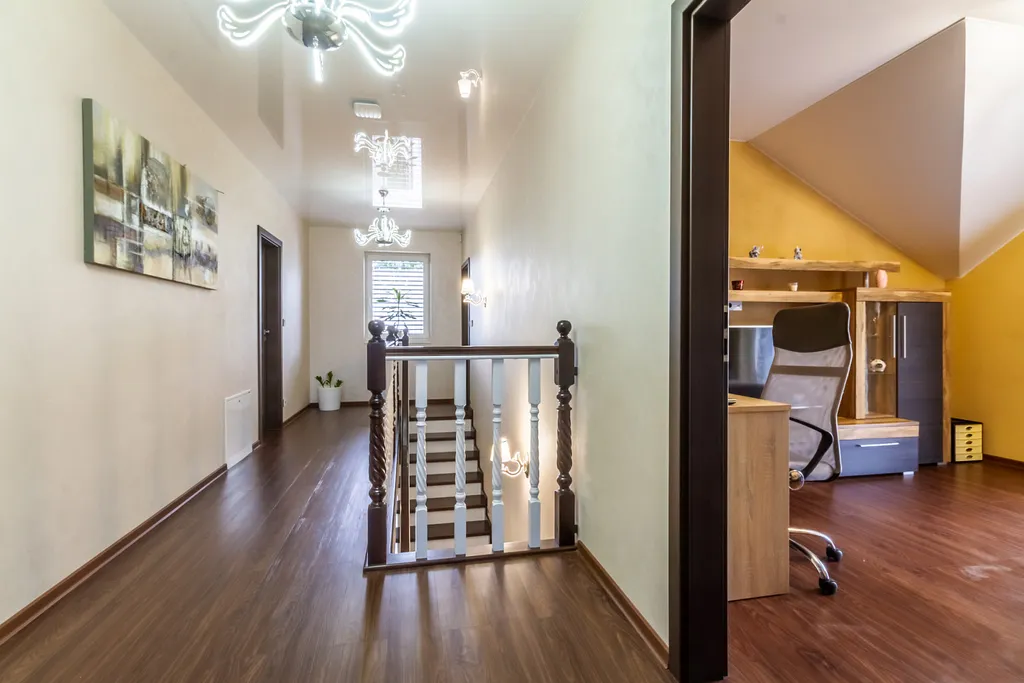 V přízemí domu vstupujete do haly, dále navazuje obývací pokoj s kompletně vybaveným kuchyňským koutem a jídelnou, ložnice, koupelna s WC a technická místnost ve které je umístěna pračka se sušičkou a výkonné tepelné čerpadlo napojené na teplovodní podlahové vytápění v obou podlažích. Z obývacího pokoje pokračujeme po otevřeném schodišti do horního patra s dispozicí 2x dětský pokoj, pracovna, ložnice, šatna a koupelna s WC.