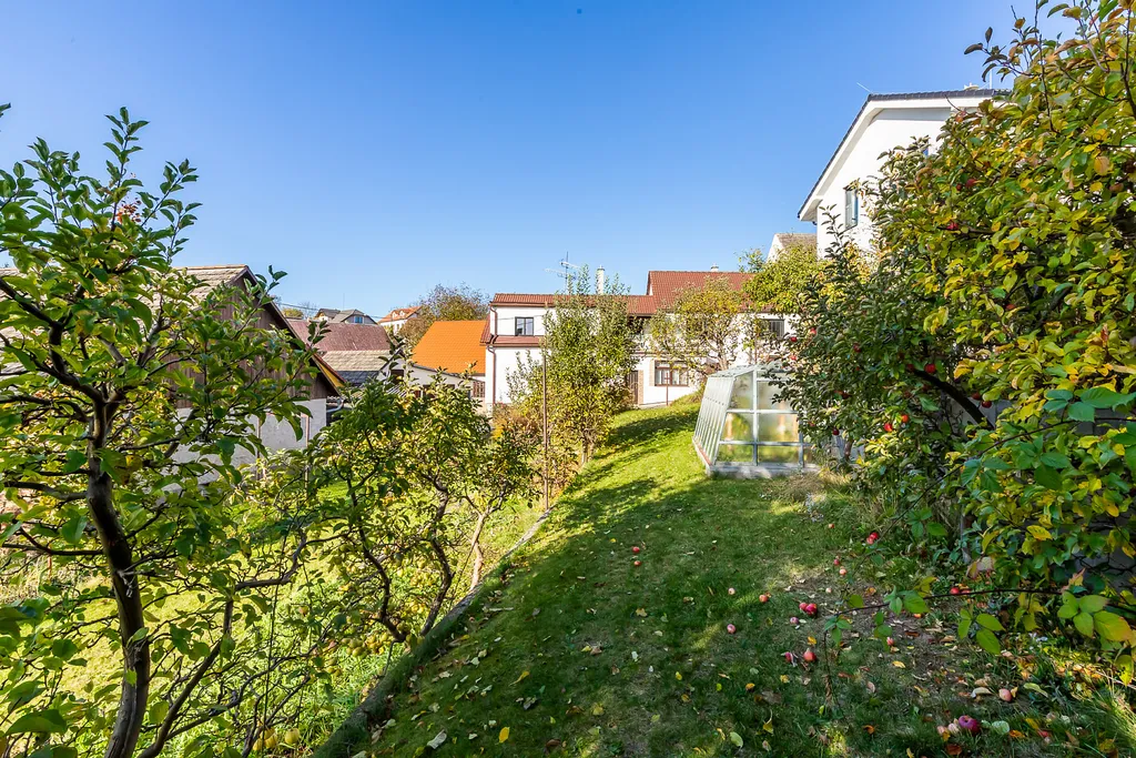 • Zahrada o rozloze 820 m² se skleníkem, pergolou s místem pro gril a přípravou na venkovní kuchyň.