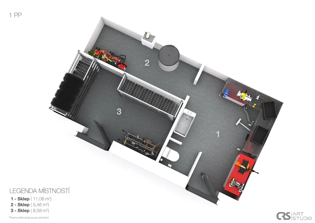 • Sklep: technická místnost, dílna, WC, sklad.