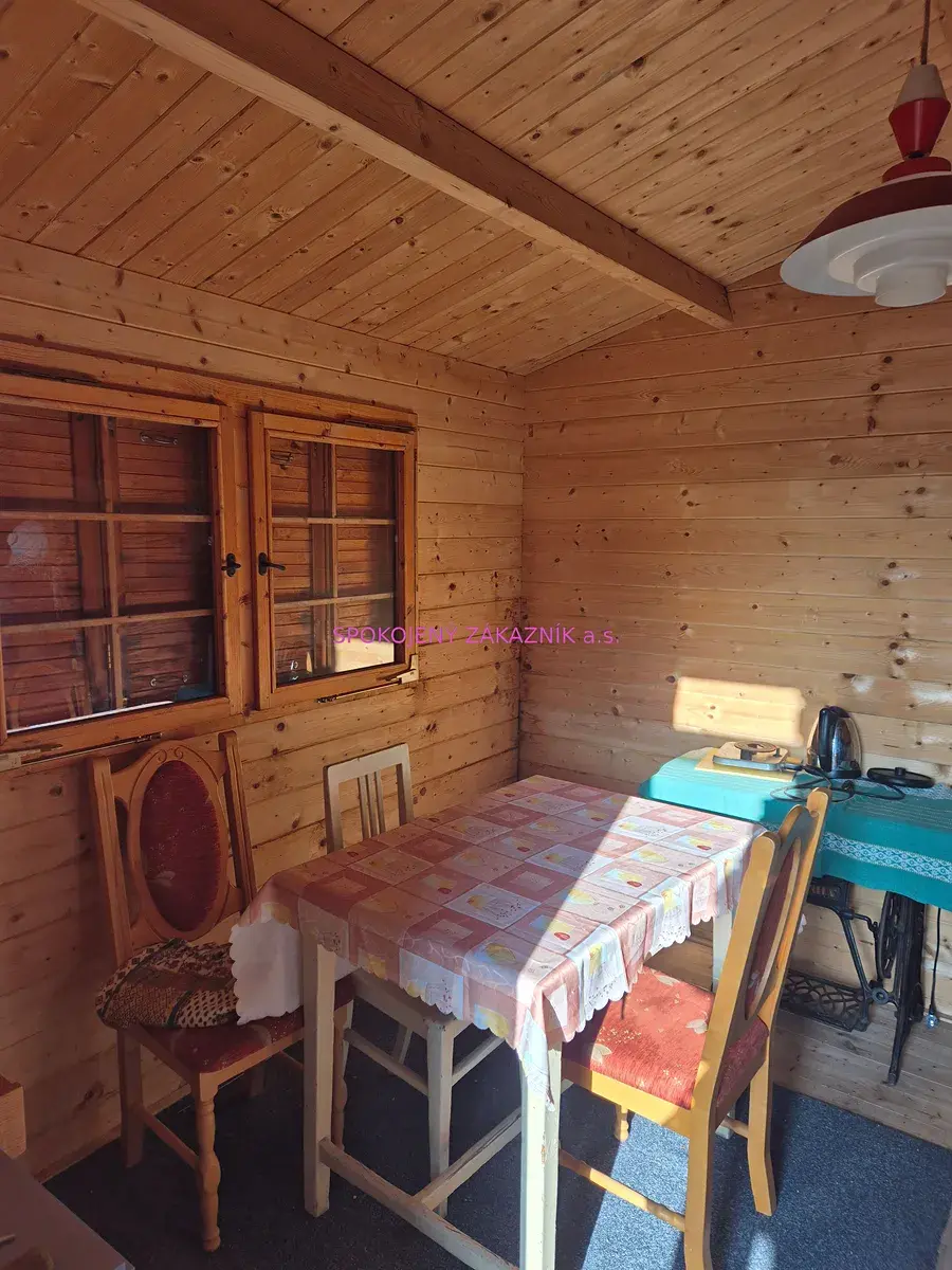 Chatka cca 5 let stará je umístěná na patkách a tvoří ji terasa, kuchyň, ložnice a menší místnost. Menší místnost je v současnosti využívaná jako komora, jinak lze využít i na případnou koupelnu. Vedle domu je dílna na nářadí a suché WC.