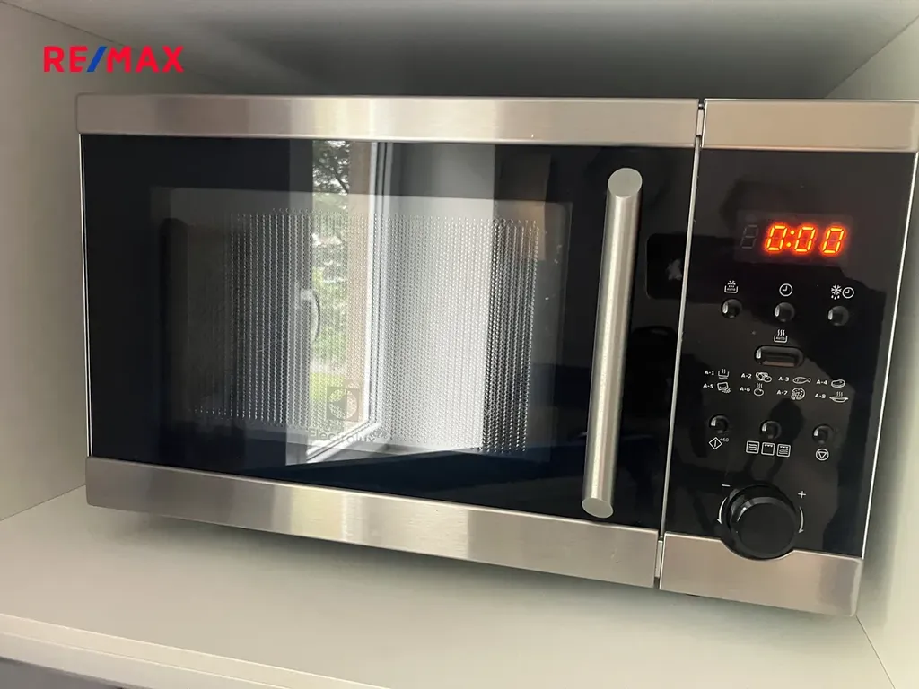 V kuchyni je moderní kuchyňská linka s vestavěnými spotřebiči - plynová varná deska, multifunkční elektrická trouba, lednice s mrazákem, digestoř, mikrovlnná trouba a myčka nádobí, k dispozici je jídelní stolek a dvě židle.
