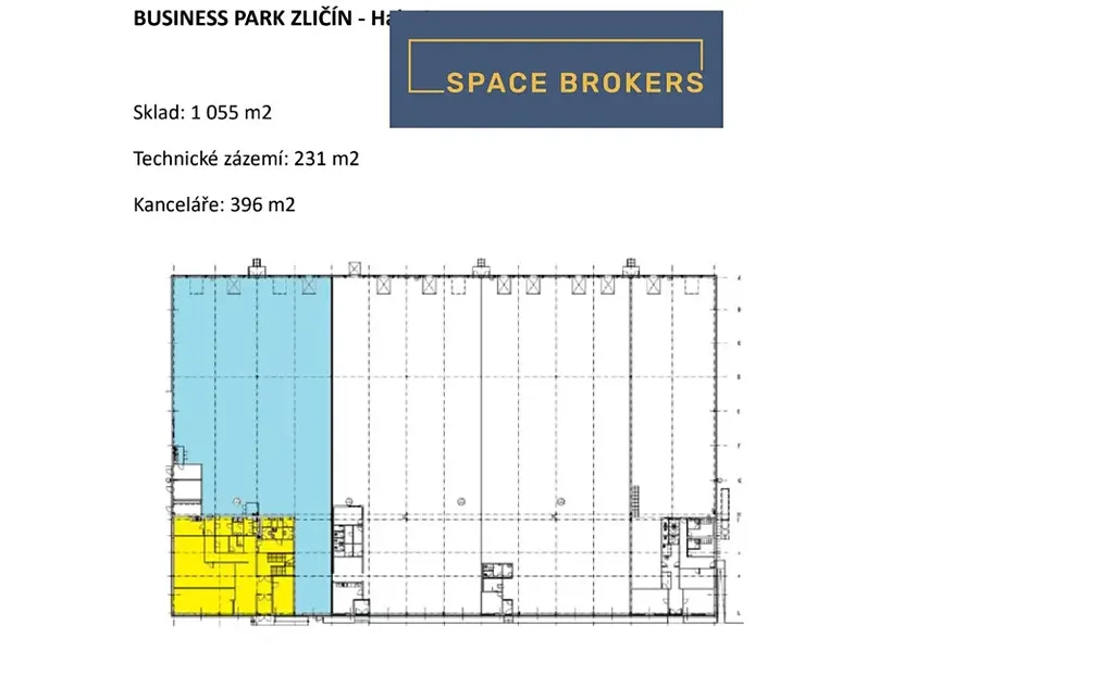 - 1.055 m2 skladovací plochy + 396 m2 kanceláří a 231 m2 sociálního zázemí (nutno pronajmout společně)