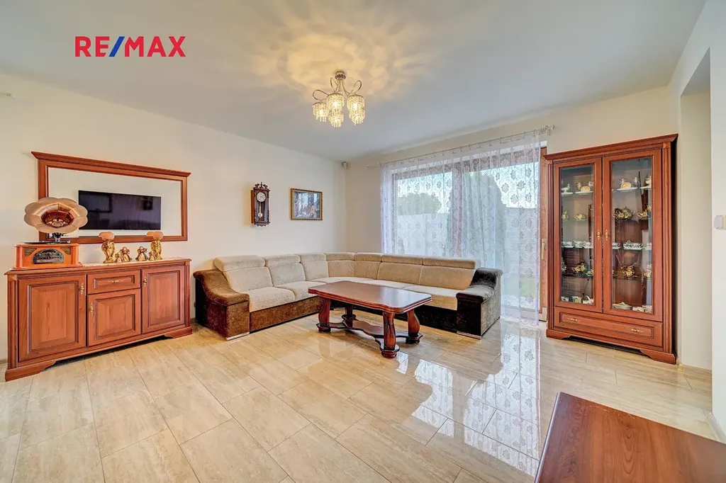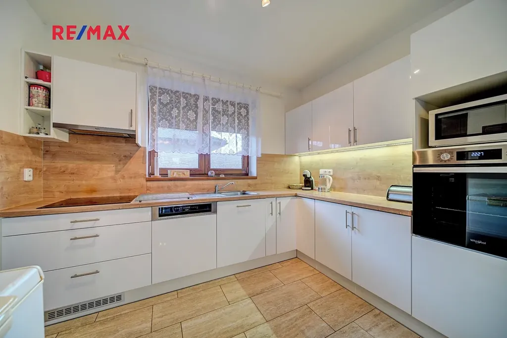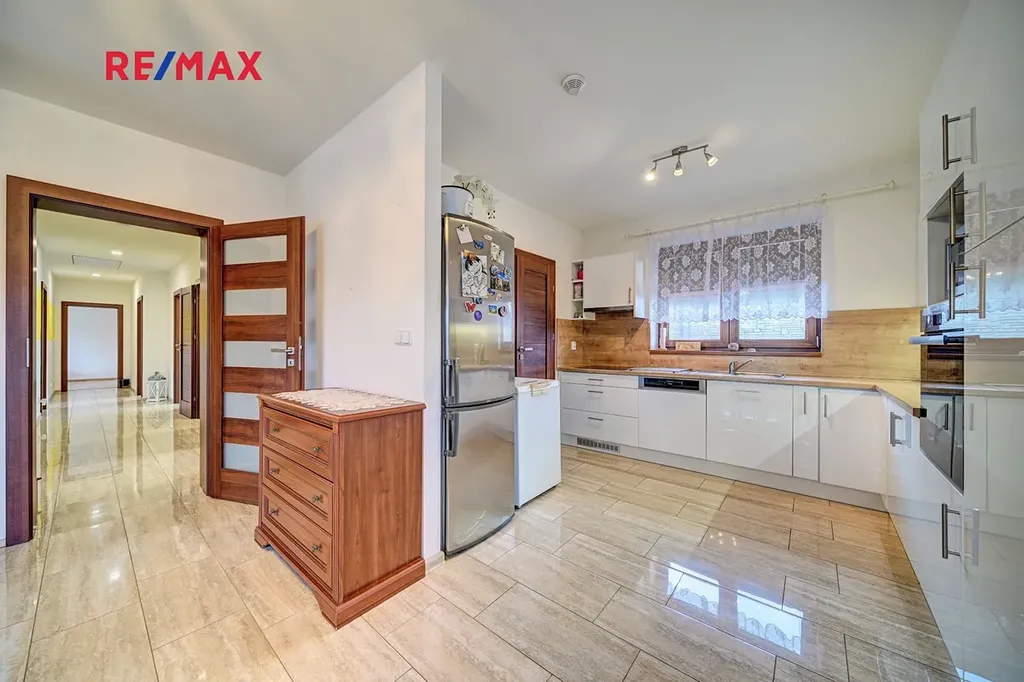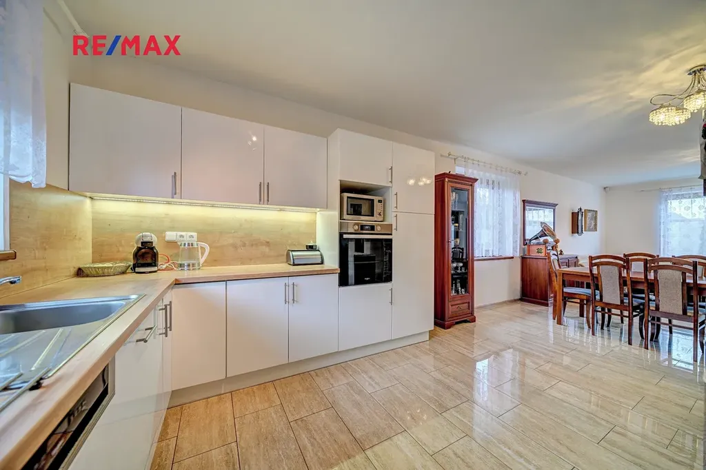 Dominantou domu je prostorný obývací pokoj s velkorysým prostorem pro rodinná setkání, plynule propojený s moderní kuchyní vybavenou kvalitními spotřebiči a praktickou spíží.