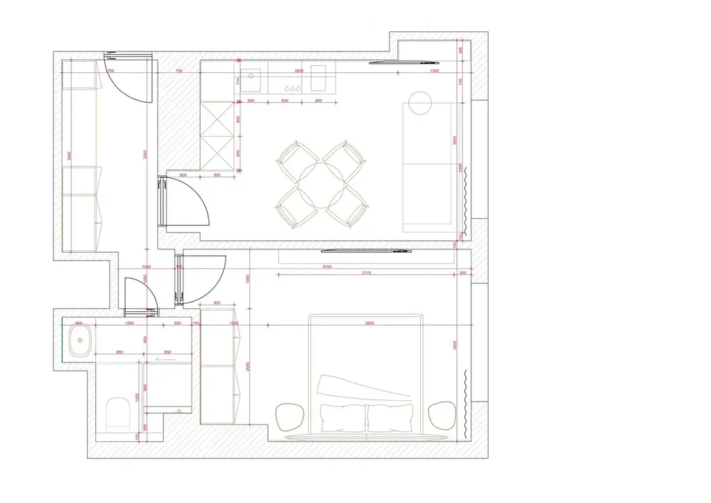 Celkově půdorys působí vzdušně, s důrazem na funkčnost a pohodlí, ideální pro jednotlivce či pár.