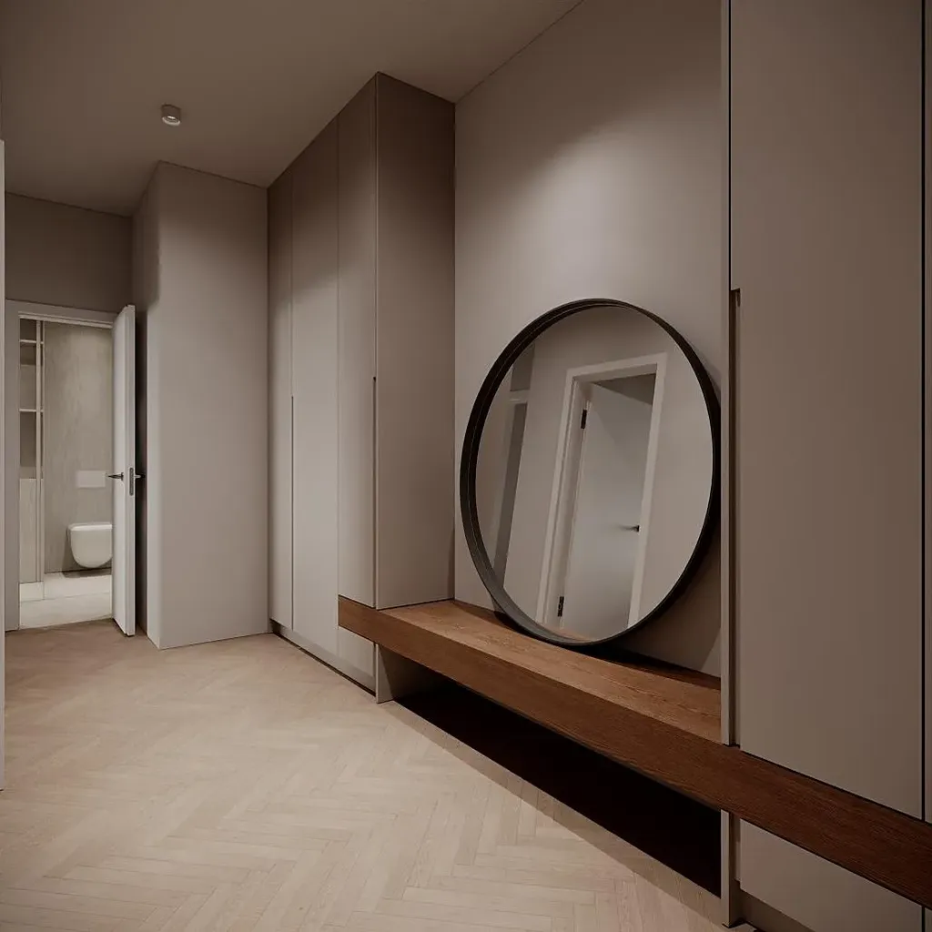 Koupelna je vybavena sprchovým koutem, umyvadlem a toaletou. V bytě nechybí ani další praktické úložné prvky.