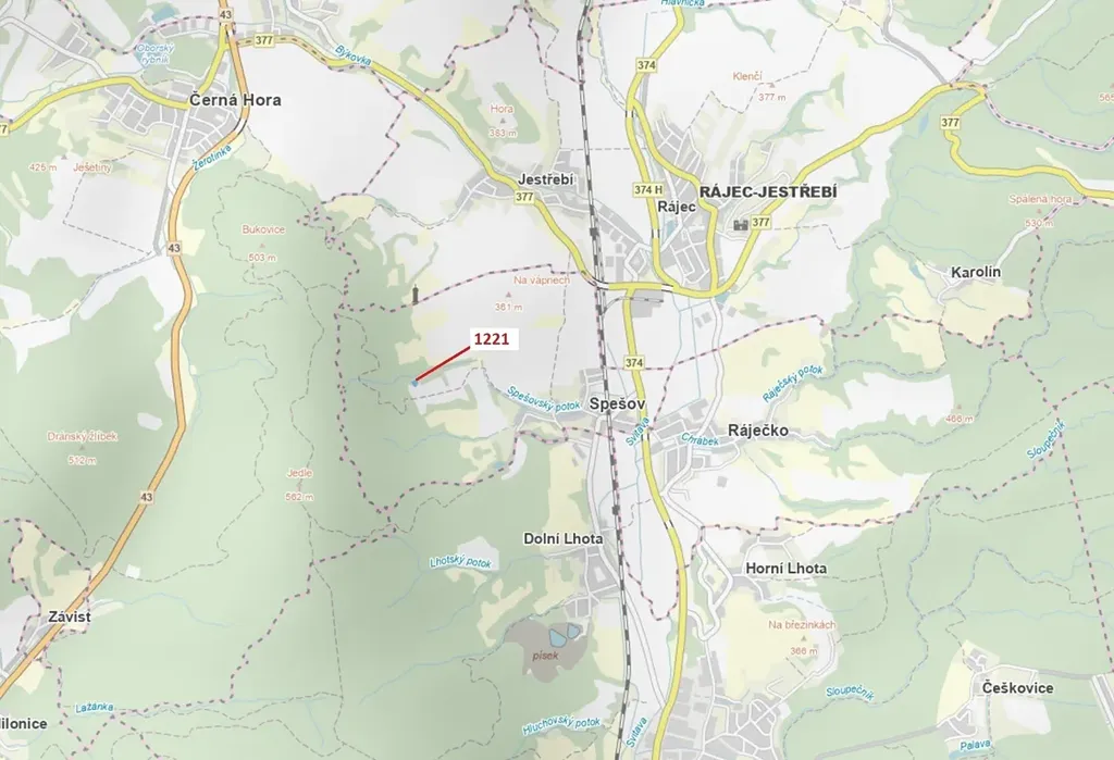 Lesní pozemek o výměře 1590 m2, parcelní číslo 1221, podíl 1/1, katastrální území Spešov, obec Spešov, obec s rozšířenou působností Blansko, okres Blansko, Jihomoravský kraj. Po těžbě.